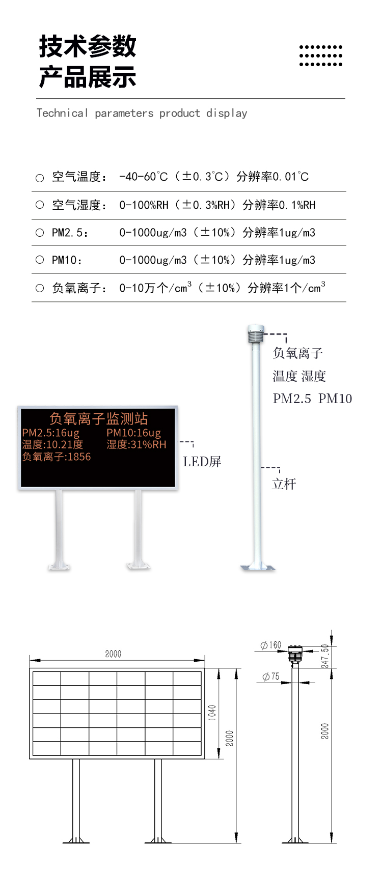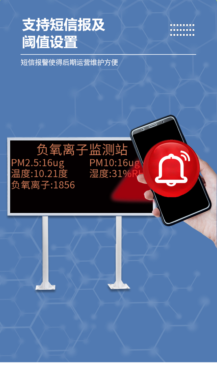 負(fù)氧離子在線監(jiān)測(cè)系統(tǒng)可全天候監(jiān)測(cè)空氣中負(fù)氧離子濃度,同時(shí)可根據(jù)用戶(hù)需求擴(kuò)展監(jiān)測(cè)項(xiàng)目,如:空氣溫度、空氣濕度、PM2.5、PM10等氣象要素;模塊化結(jié)構(gòu)設(shè)計(jì),傳感器都可以單獨(dú)替換,配備專(zhuān)業(yè)安裝支架,現(xiàn)場(chǎng)可通過(guò)LED屏幕直接讀取數(shù)據(jù),亦可遠(yuǎn)程云平臺(tái)/WEB/微信公眾號(hào)實(shí)時(shí)查看數(shù)據(jù),后期運(yùn)營(yíng)維護(hù)方便。