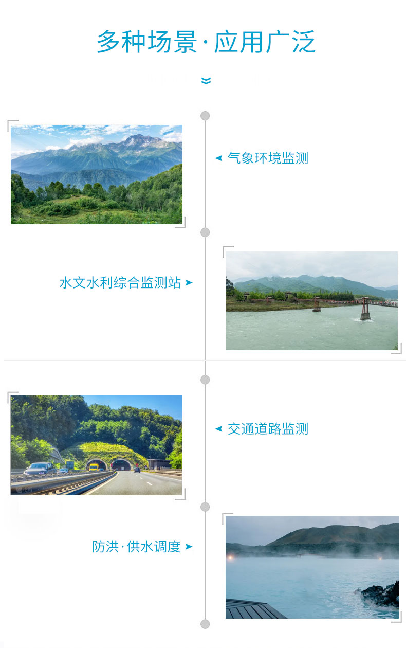 壓電雨量監(jiān)測站可廣泛地應(yīng)用于氣象、防汛、農(nóng)業(yè)、水文水利、環(huán)保、高速公路、機(jī)場和港口等領(lǐng)域。既可為氣象臺(站)、水文站、農(nóng)林、國防、野外測報站等有關(guān)部門測量降水量、降水強(qiáng)度、降水時間等參數(shù)提供原始數(shù)據(jù);也可為防洪、供水調(diào)度、電站、水庫水情管理提供有參考價值的實(shí)時數(shù)據(jù)。